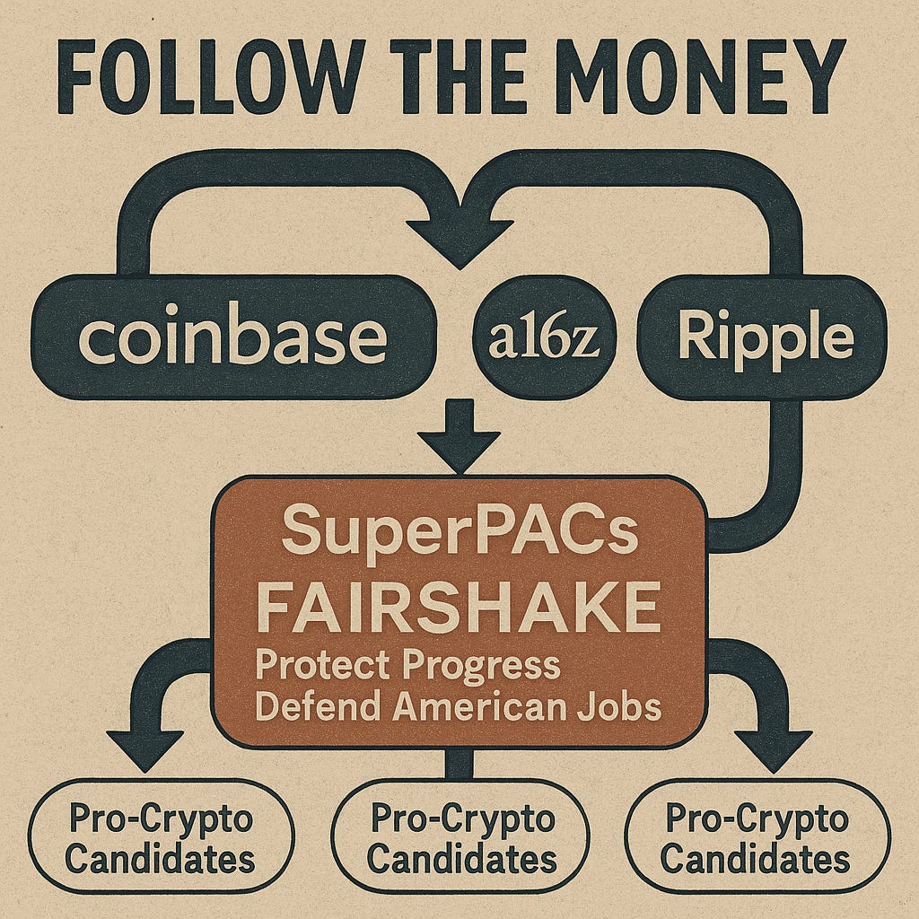SuperPACs like Fairshake (now the largest in the country at $260 million), Protect Progress, and Defend American Jobs are all funded by Coinbase, a16z, Ripple, and other crypto giants.